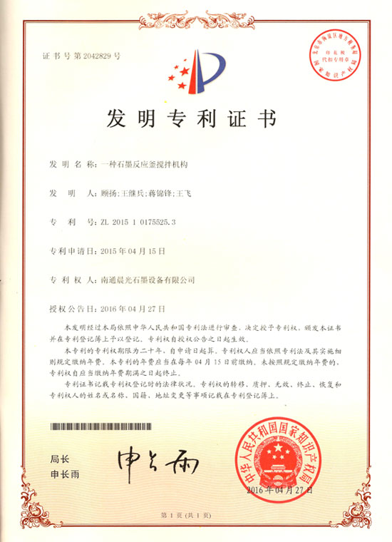 發明專利 :一種石墨反應釜的攪拌機構 專利號:ZL 2015 1 0175525.3