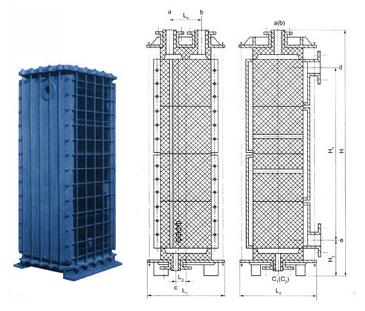 矩形塊孔式石墨熱交換器由截面為矩形的單元換熱塊疊裝而成,整體強度高,耐熱沖擊性能好,傳熱效率高使用壽命長。本公司常規生產均為內聯式單向耐腐蝕3JK型與KS型兩系列。