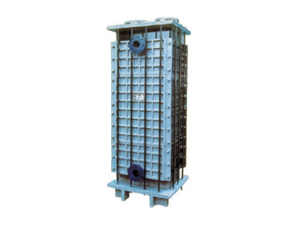 矩形塊孔式石墨換熱器是由若干數量的立方、矩形石墨換熱塊、上下石墨封頭及其金屬蓋板和兩側金屬側蓋等主要零件組成,各零件之間用襯墊密封,上下金屬蓋板和兩側蓋板,用長拉桿螺栓連接與石墨塊體緊固為一體。它具有結構簡單、使用可靠、維修方便和優良的抗熱沖擊性、抗震動性。